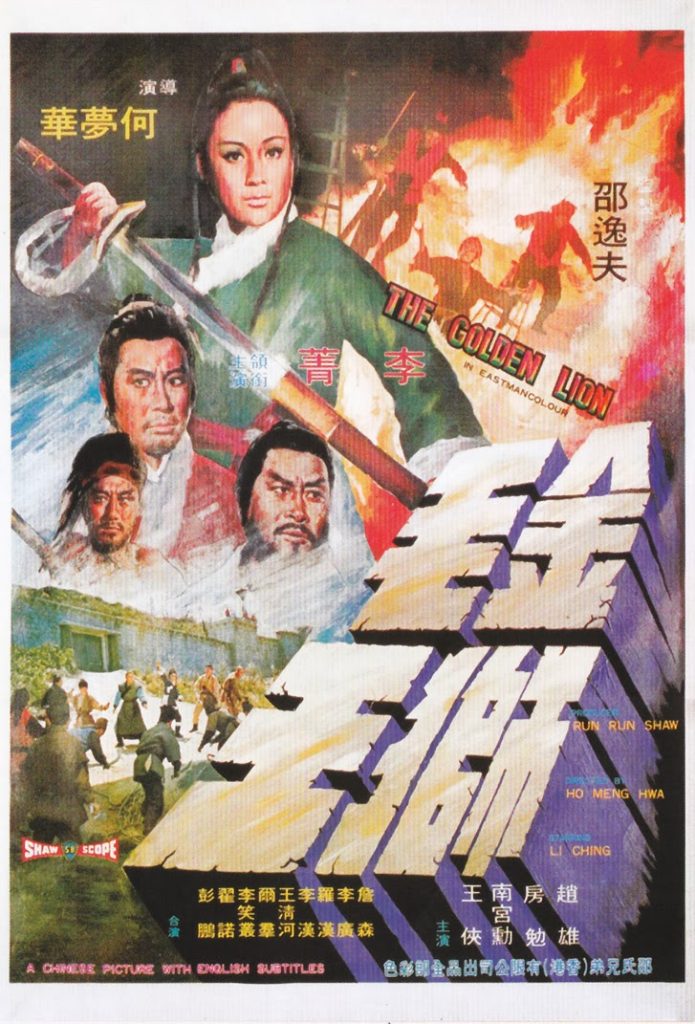 本片的金毛狮王与金庸《倚天屠龙记》小说人物无关,导演为何梦华,编剧是江阳。故事描述,侠盗金毛狮戴逍遥(赵雄),武功高强,为血衣帮主汪劲草(王侠)所忌,一夜戴雨夜归家途上,遭汪率徒众突袭,胸部中五毒神砂掌,只好突围逃亡;戴原已患恶疾,现又告受 伤,幸遇太湖七狮,送往神医吕伯景(房勉)处救治;吕决定与儿子文业(南宫勋)、女儿文芳(李菁),携戴赴回魂谷采七叶青莲治恶疾,惟期间遭汪追杀,险象横生……